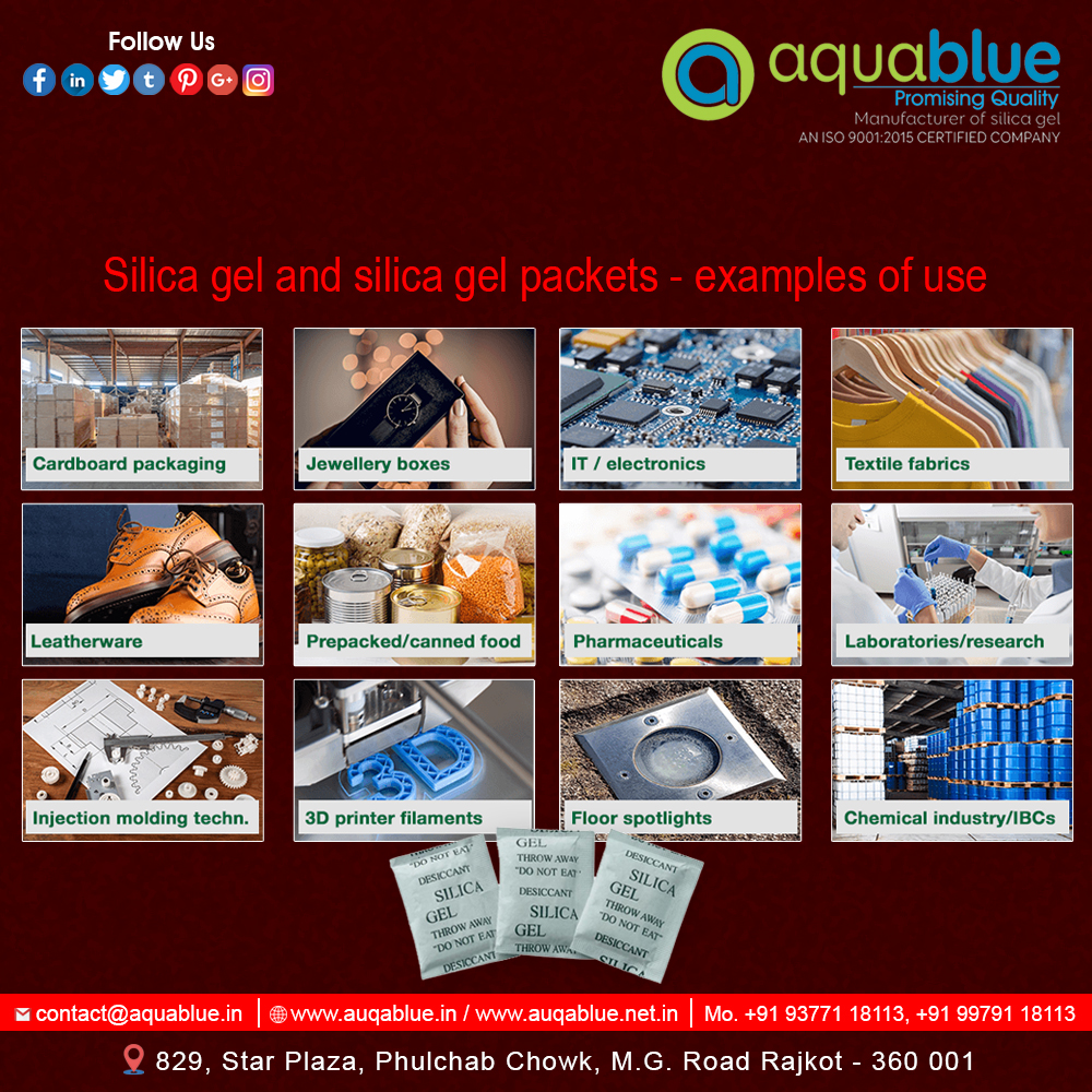 Applications of Aquablue Silica Gel Products, Packing Industries, Valves preservation, Pressure vessel Manufacturers, Optical instruments and devices, Pharmaceutical Products, Textiles, Dry out a Wet Mobiles / fishing files, Drying and cleaning of air and gases, Electronic equipment’s, Food Products, Drying and storage of Flowers and Seeds, Drying of analytical sample/Solvent/Synthetic, Moisture Absorbent in finished leather products, www.aquablue.in, Protection of Export Consignments from moisture in salty atmosphere. Aquablue Silica Gel Manufacturer, www.aquablue.in,