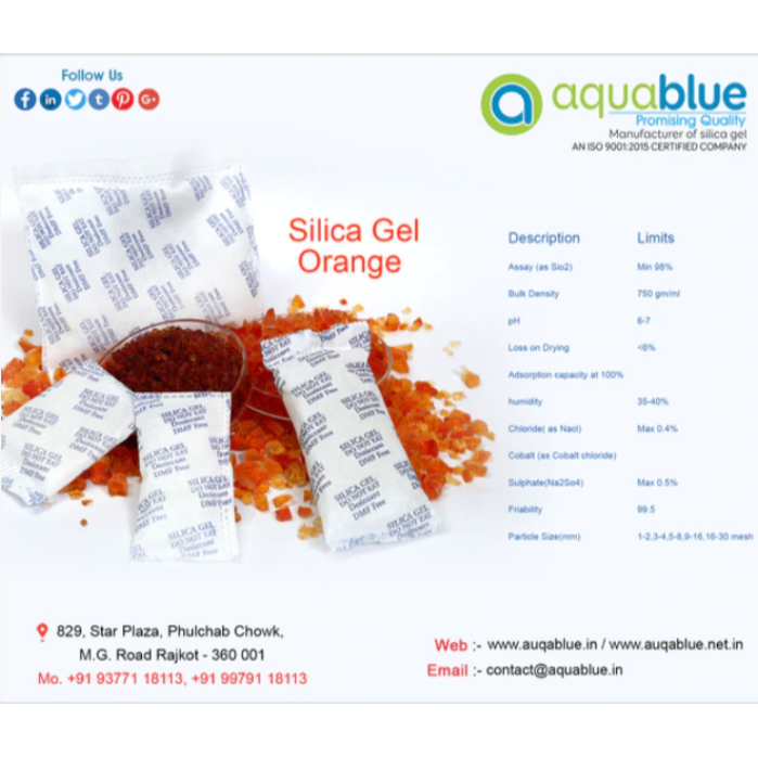 Silica gel adsorbs moisture, which in effect, locks in moisture and limits the damaging results of humidity. There are several kinds, colors and sizes of silica gel. The three most commonly available colors for silica gel are white, blue indicating and orange indicating. Indicating silica gels are processed with moisture indicators that change color to show when the product is saturated and needs to be regenerated.