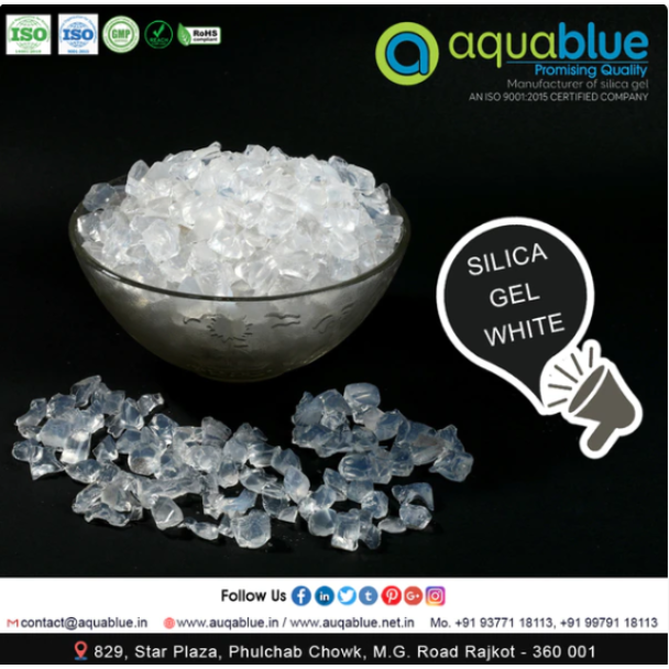 White silica gel in amorphous crystal form, in granule format, is a desiccant material without color indicators. It is available in two particle sizes: standard (2 to 5 mm diameter) and fine (0.5 to 2 mm diameter).